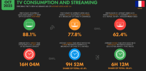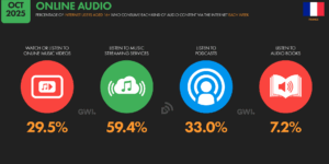 L’audio connaît également une progression remarquable : près de 60 % des Français écoutent de la musique en streaming, et un tiers consomme des podcasts, en forte hausse sur un an.