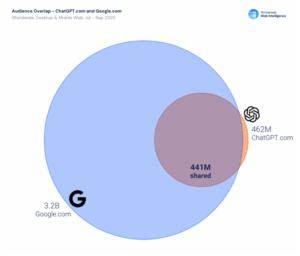 L’essor de l’IA générative ne signifie pas la disparition des moteurs de recherche traditionnels. Les données montrent que 95 % des utilisateurs de ChatGPT utilisent également Google, soit environ 441 millions d’utilisateurs communs sur un trimestre. Les internautes alternent entre recherche classique et interfaces conversationnelles selon leurs besoins.