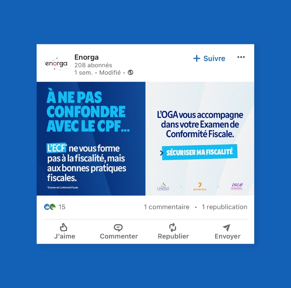 ENORGA souhaitait valoriser le dispositif de l’Examen de Conformité Fiscale (ECF) pour les Organismes de Gestion Agréés (OGA) partenaires. L’objectif : créer une campagne de communication nationale déclinable localement afin de sensibiliser les professionnels indépendants à l’importance de la conformité fiscale.